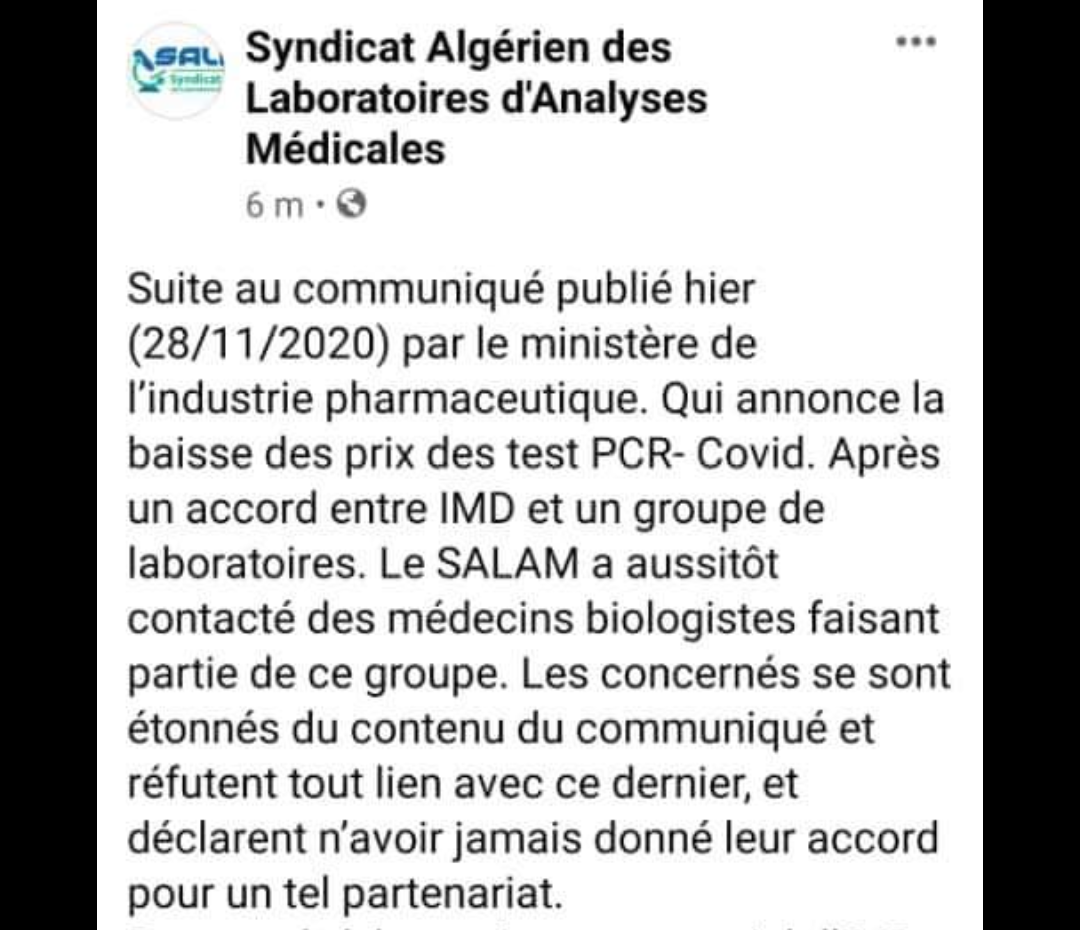 “ Suite au communiqué publié hier (28/11/2020) par le ministère de l’industrie pharmaceutique qui annonce la baisse des prix des test PCR- Covid, après un accord entre IMD et un groupe de laboratoires, le SALAM a aussitôt contacté des médecins biologistes faisant partie de ce groupe. Les concernés se sont étonnés du contenu du communiqué et réfutent tout lien avec ce dernier, et déclarent n’avoir jamais donné leur accord pour un tel partenariat”, lit-on dans le démenti diffusé sur le réseau social du syndicat.