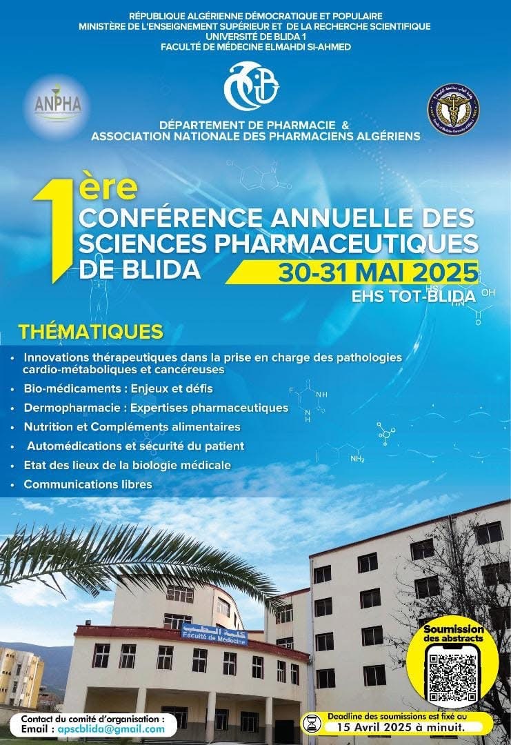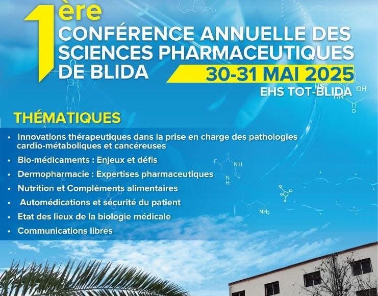 Blida accueillera les 30 et 31 mai 2025 la première édition de la Conférence annuelle des sciences pharmaceutiques, un rendez-vous scientifique d’envergure, organisé par le Département de pharmacie de la Faculté de médecine El Mahdi Si-Ahmed (Université de Blida 1), en collaboration avec l’Association nationale des pharmaciens algériens (ANPHA). L’événement se tiendra au sein de l’EHS de traumatologie orthopédique (TOT-Blida), et ambitionne de devenir un espace fédérateur de débats, de transmission du savoir et de valorisation de la recherche pharmaceutique nationale.