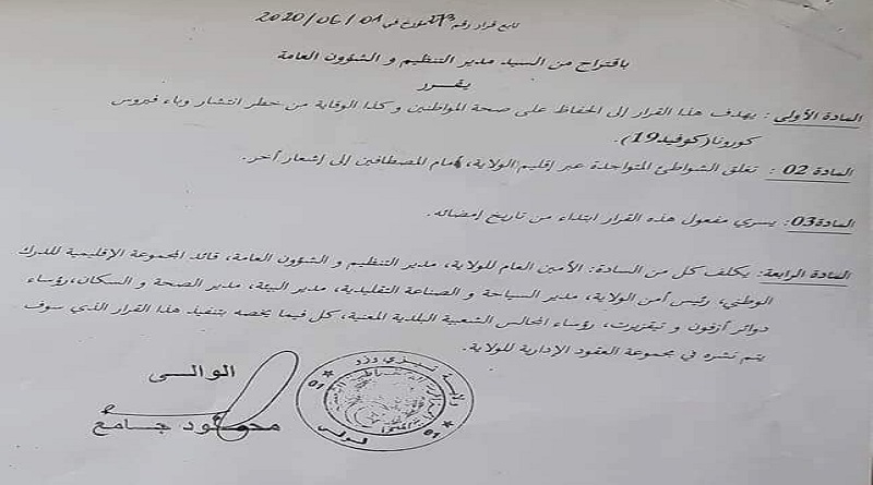 La circulaire du wali a signifié que des sanctions seront appliquées à ceux qui vont transgresser cette décision temporaire. La décision précise qu’elle rentre en vigueur à partir 1er juin 2020, date de sa signature.