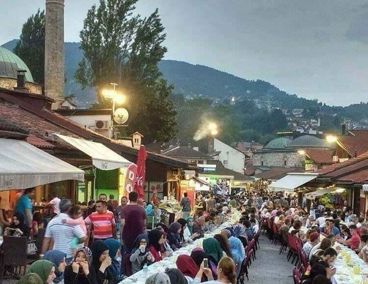 Après la prière du Maghrib, vient l’heure de l’iftar. Que ce soit dans les maisons ou dans les rues où sont organisés des iftars collectifs, les tablées sont garnies de mets succulents, rappelant la richesse et la diversité de la gastronomie bosnienne, faite à base de légumes et de viandes de bœuf, de mouton et volaille. Une cuisine aux influences à la fois occidentales et orientales (turque) et dont la saveur ne laisse pas les palais indifférents.