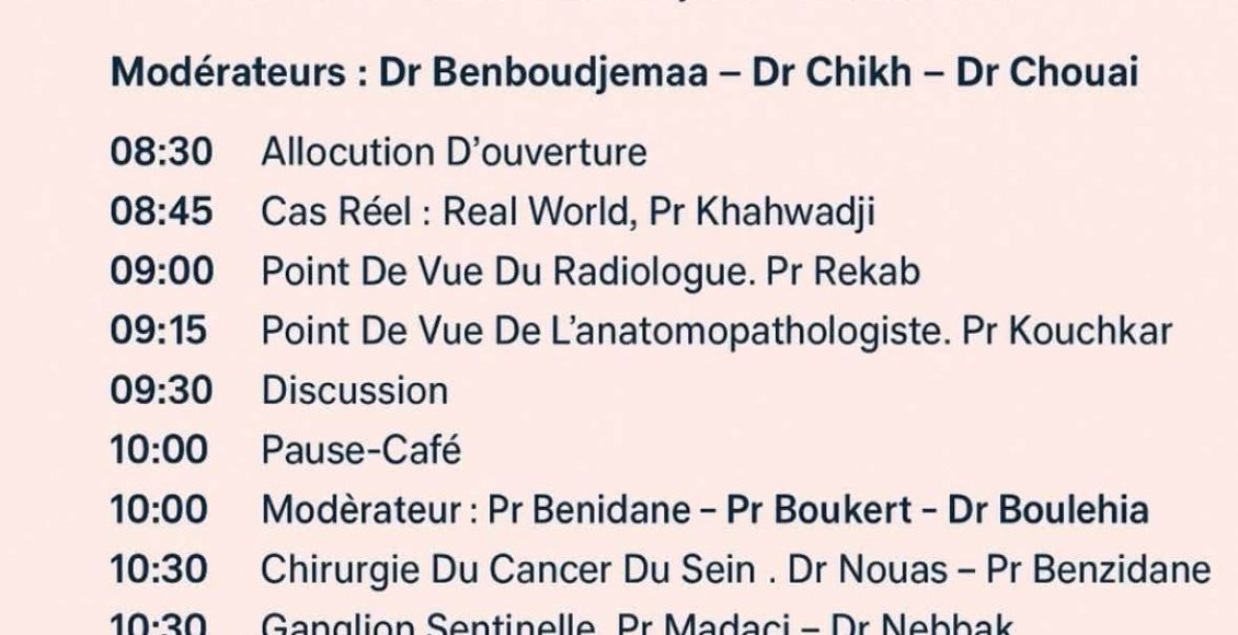 La matinée se poursuivra sous la modération des Pr Benidane, Pr Boukert et Dr Boulehia, avec des communications consacrées à la chirurgie mammaire (Dr Nouas, Pr Benzidane), à la technique du ganglion sentinelle (Pr Madaci, Dr Nebbak), à la chimiothérapie (Dr Laouachra) et à la radiothérapie (Pr Benzidane Kahina).